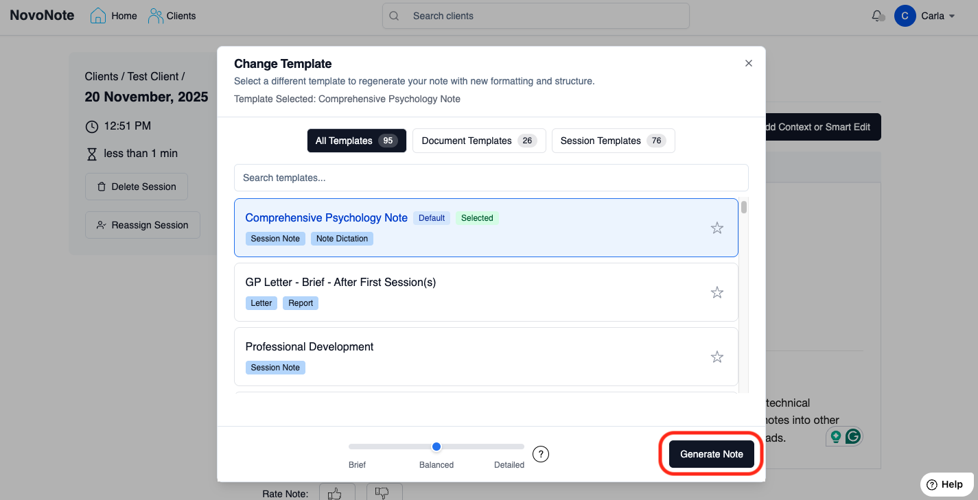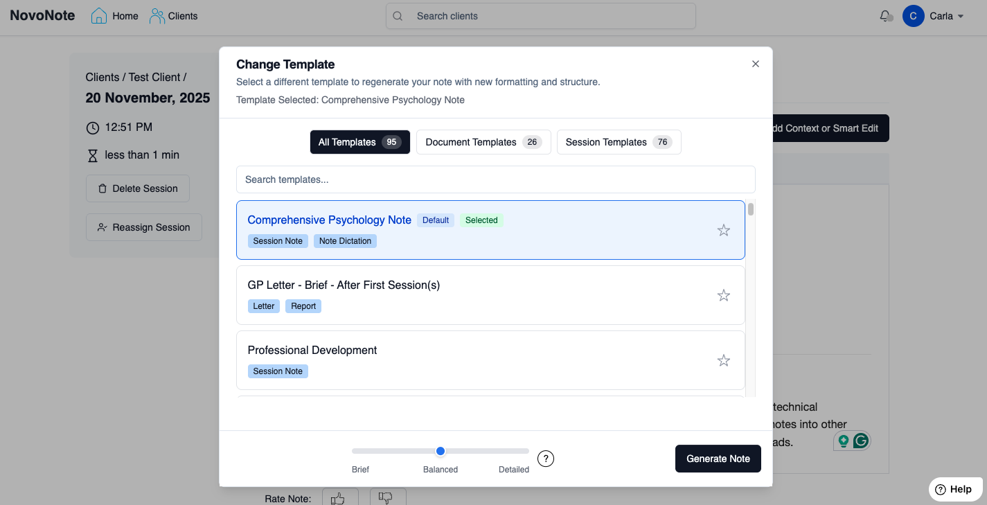 Tip: For more information to help you make your selection, explore the descriptions and examples in NovoNote's Template Library. Here you can review our growing range of templates, designed to support a wide range of therapeutic modalities, and reporting and documentation needs.