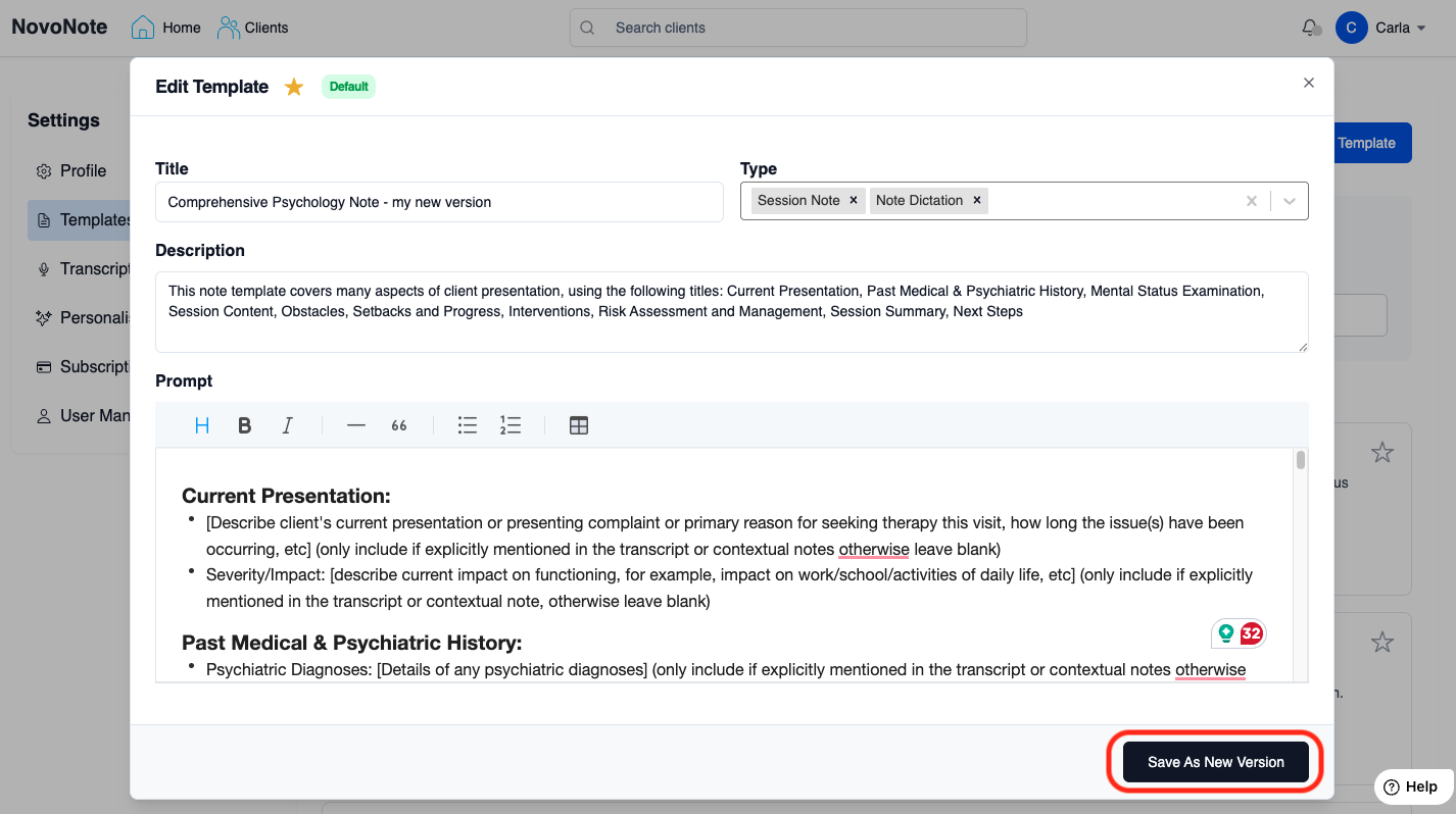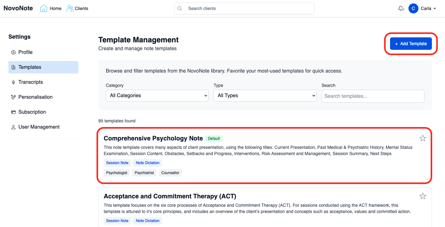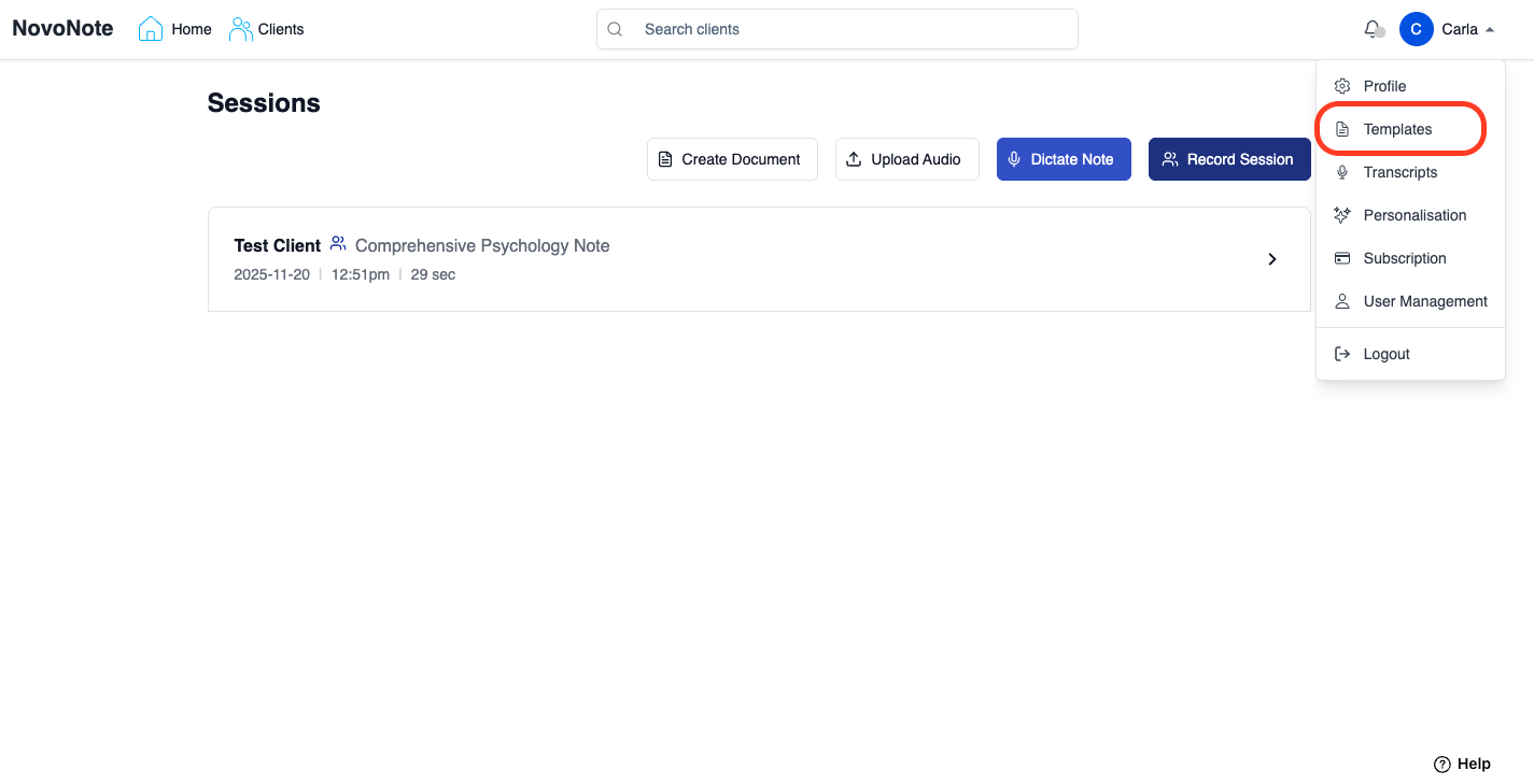 Custom templates allow you to tailor NovoNote to your specific clinical needs, preferred documentation style, and therapeutic framework. Whether you want to refine an existing template or create your own, NovoNote gives you full control over structure, tone, and prompts - ensuring notes reflect your practice.