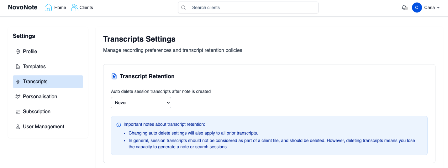As mental health professionals, maintaining control over documentation is essential for ethical practice, confidentiality, and accuracy. Whether you need to delete a note due to errors, outdated information, or privacy considerations, NovoNote AI Scribe gives you clear options for securely removing session notes and transcripts.