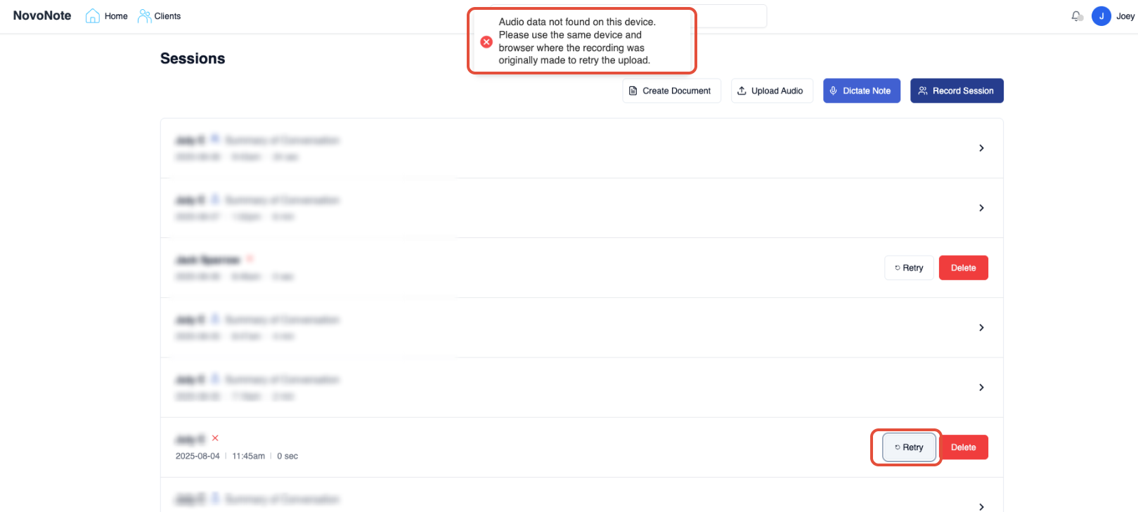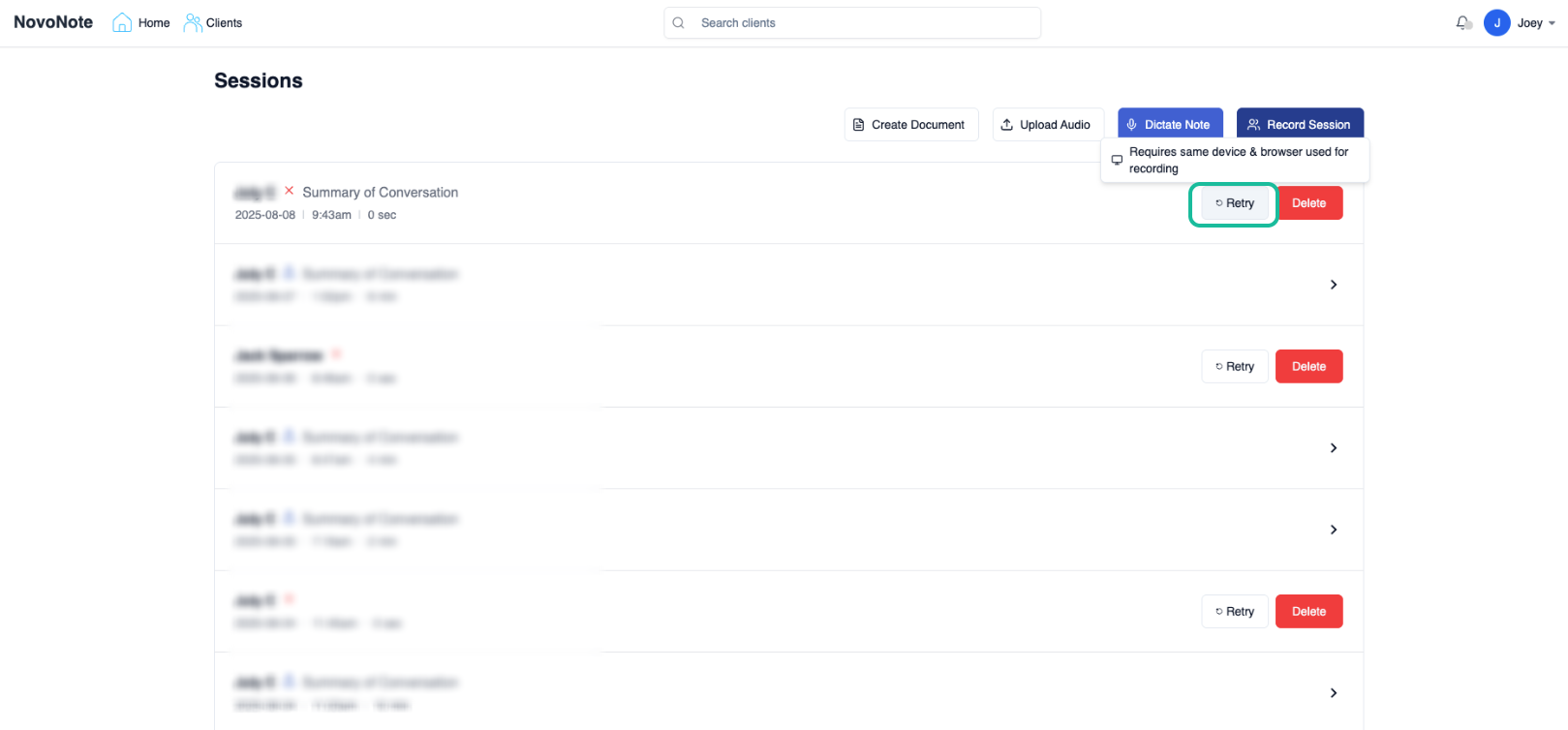 If the transcription fails to appear initially, use the Retry option. In most cases, this reprocesses the session content and regenerates the transcript/notes, provided the audio content was successfully captured during the session.