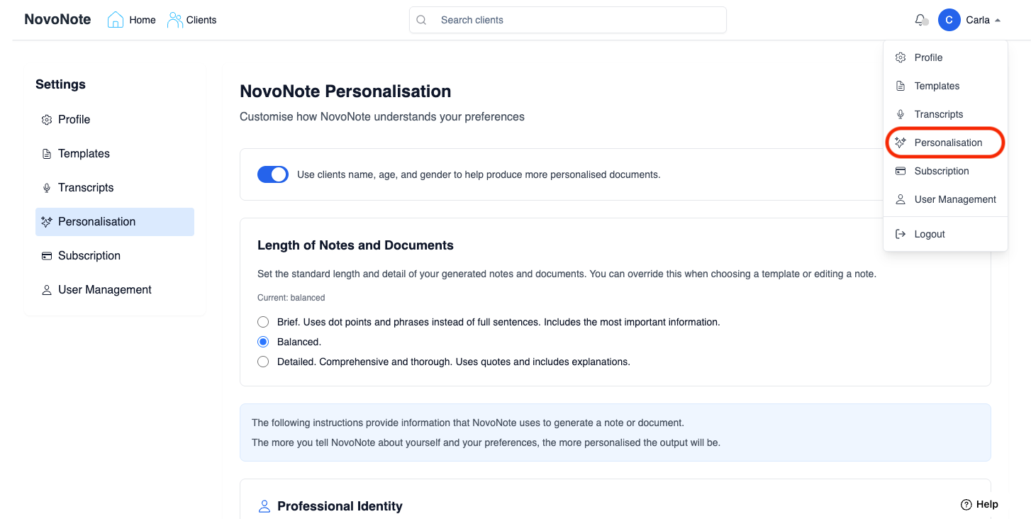 Personalisation in NovoNote allows you to tailor the AI to your professional context, therapeutic approach, and writing style. By customising key preferences—such as your clinical focus, treatment modalities, formatting guidelines, and tone—you can ensure that NovoNote produces documentation that is professionally appropriate and aligns with how you genuinely work.