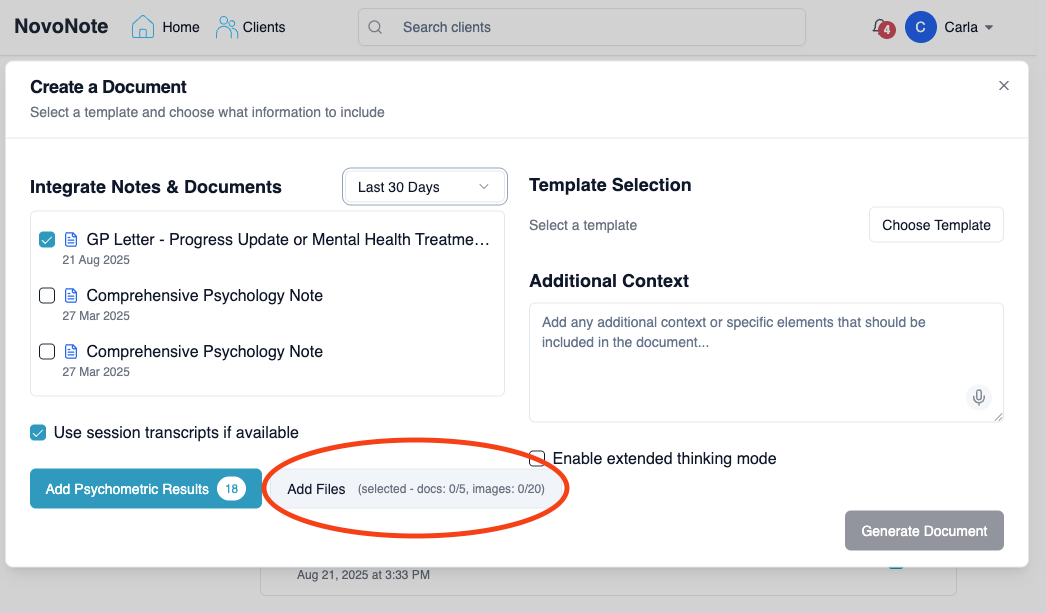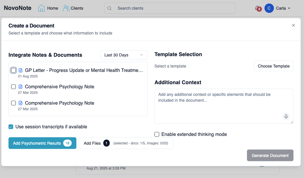 ? To learn more about how to create a document in NovoNote, also see: Creating Documents - Generating Documents from Multiple Sessions Over TimeBy following these steps, you can quickly integrate all key documents to generate clinically richer and more comprehensive session notes, letters and reports.