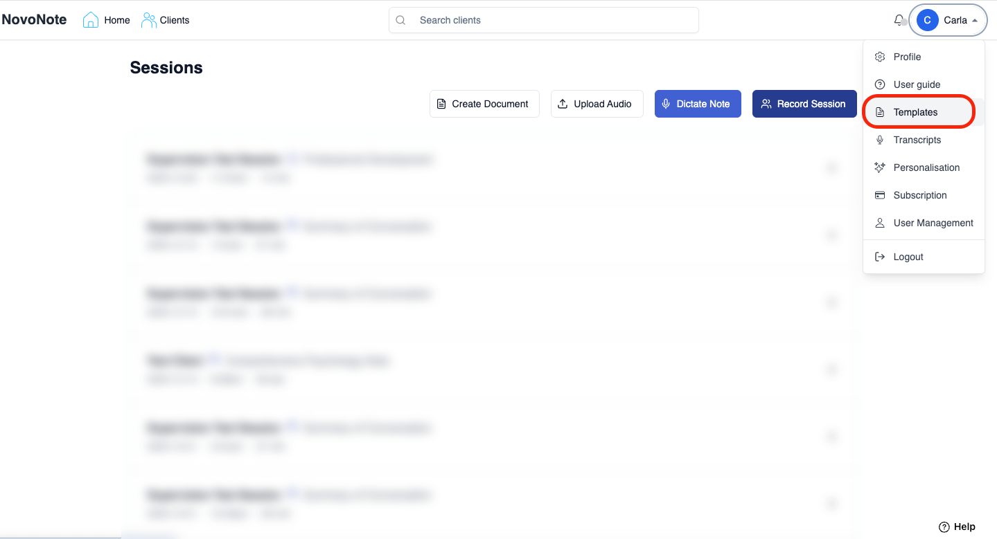 1. Navigate to "Templates" in the dropdown settings menu (tip: click on your name in the top right corner to open settings):