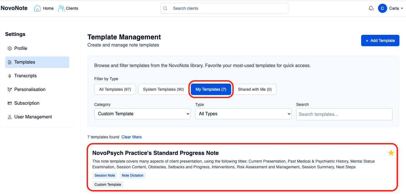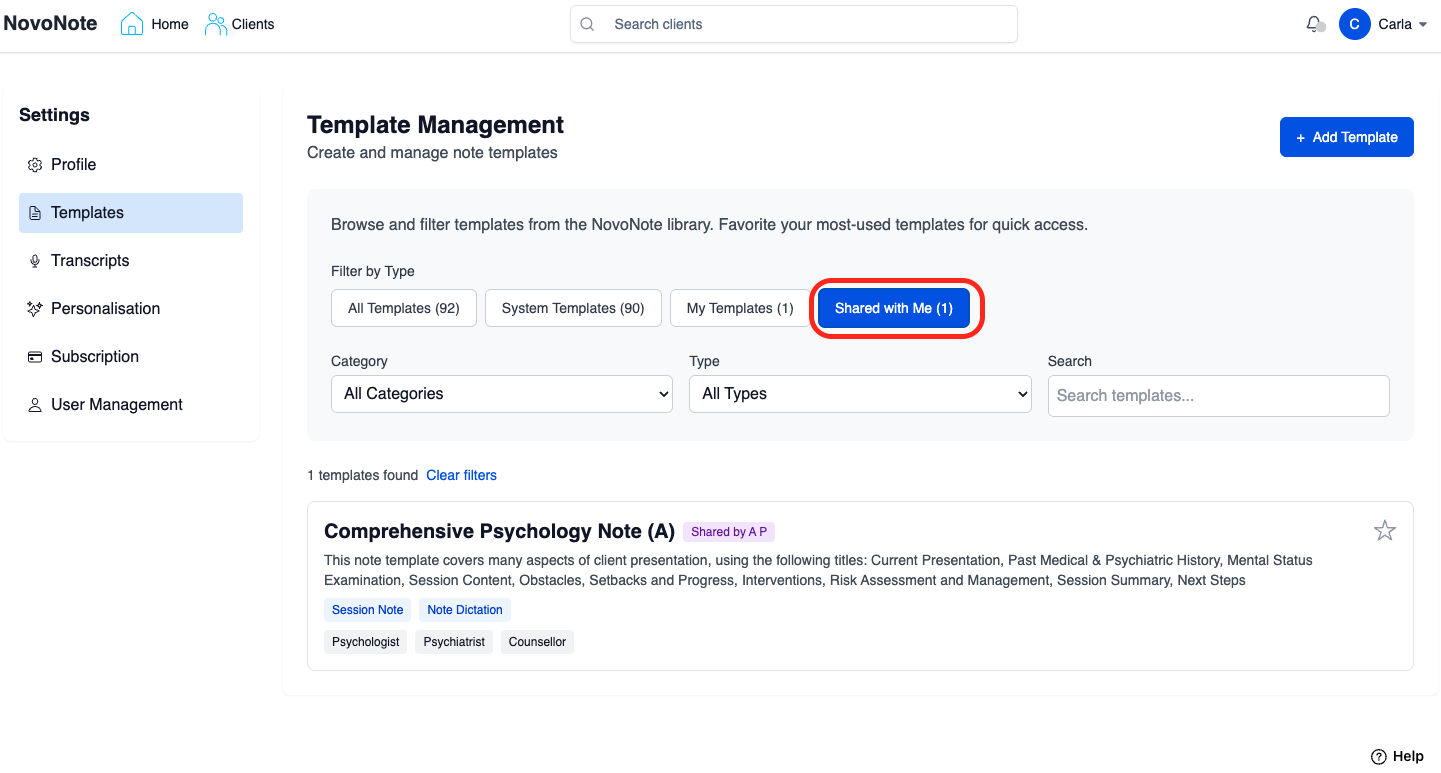 Clinicians within your Practice Plan will now be able to view the shared template in their template library by selecting the "Shared with Me" filter. The template will also be available for selection when recording a session.