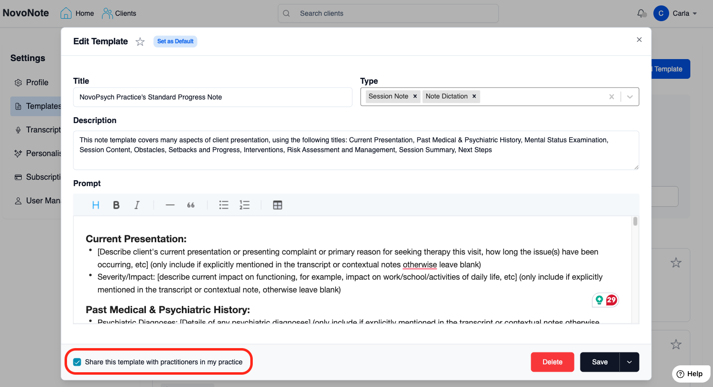Sharing custom note templates within a practice allows practice users to document clinical work using agreed frameworks that align with professional standards, clinical governance and compliance requirements.