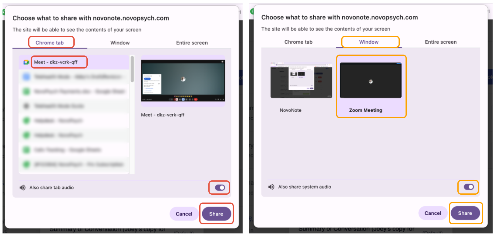 2. Share your telehealth software window or browser tab. Always enable “Sharing Audio” to capture session audio reliably.