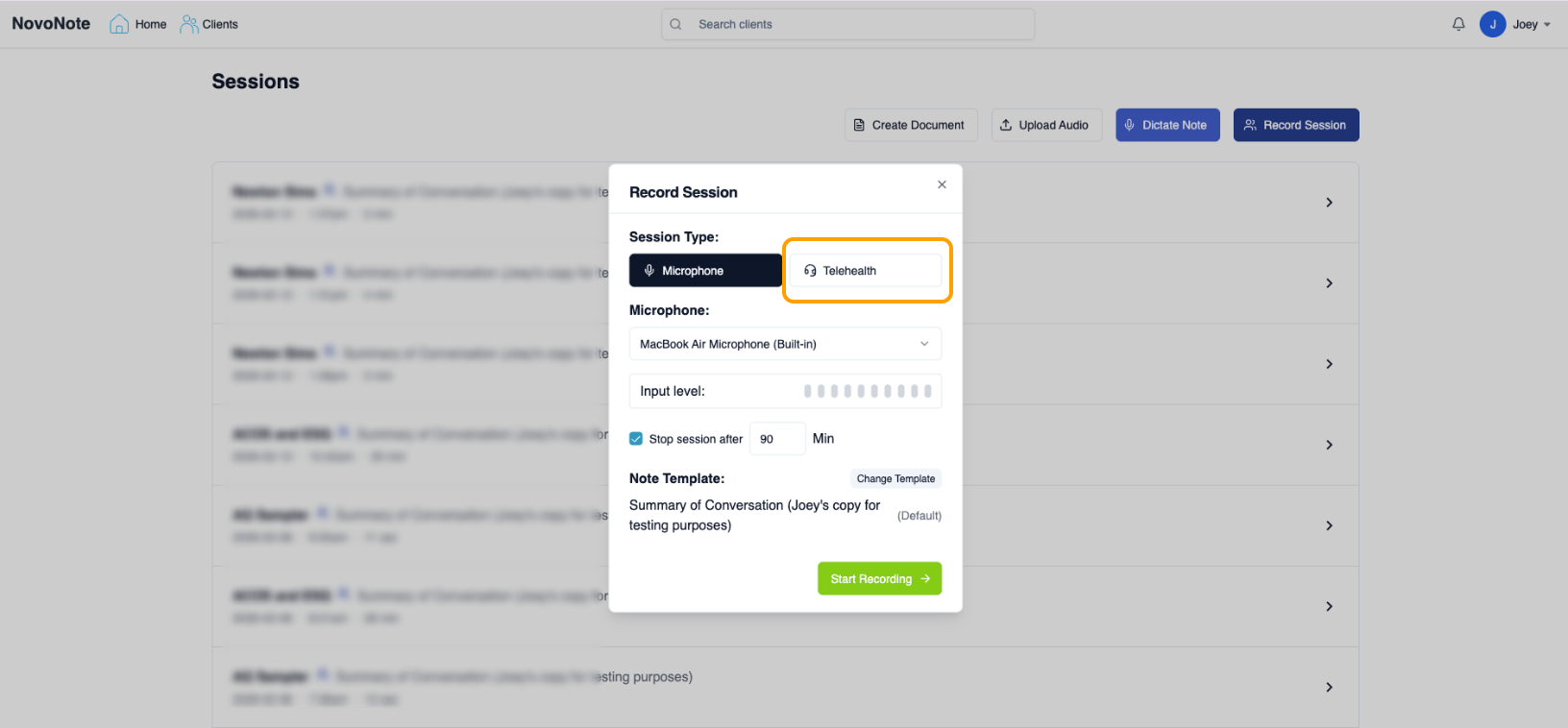 Telehealth Mode has since been introduced in NovoNote, designed to improve transcript accuracy and AI note quality during your telehealth sessions.