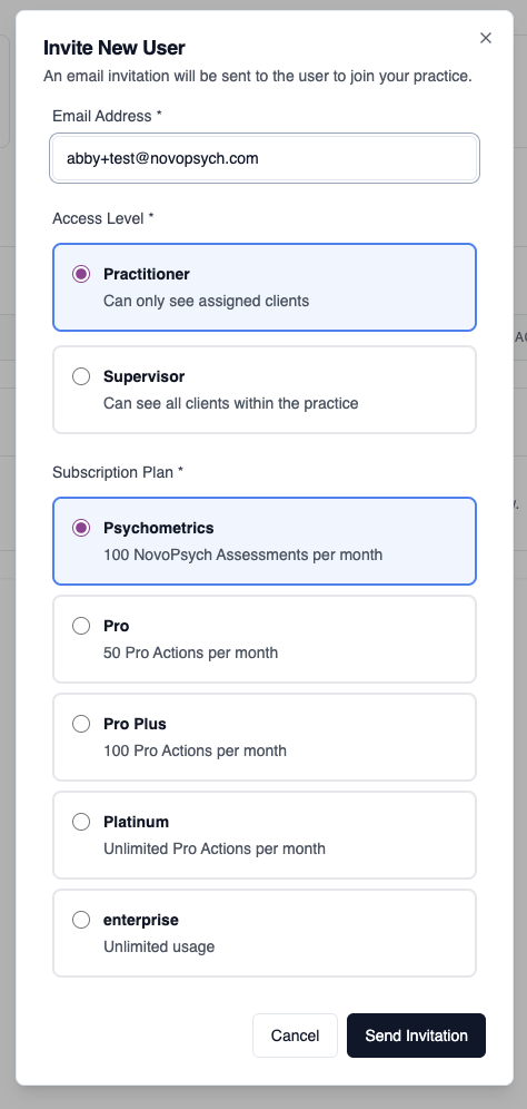 A Practice Plan allows practices and organisations to manage multiple practitioners under a single account. This makes it easier to invite clinicians, assign subscription tiers, monitor usage, and manage access from one central account.